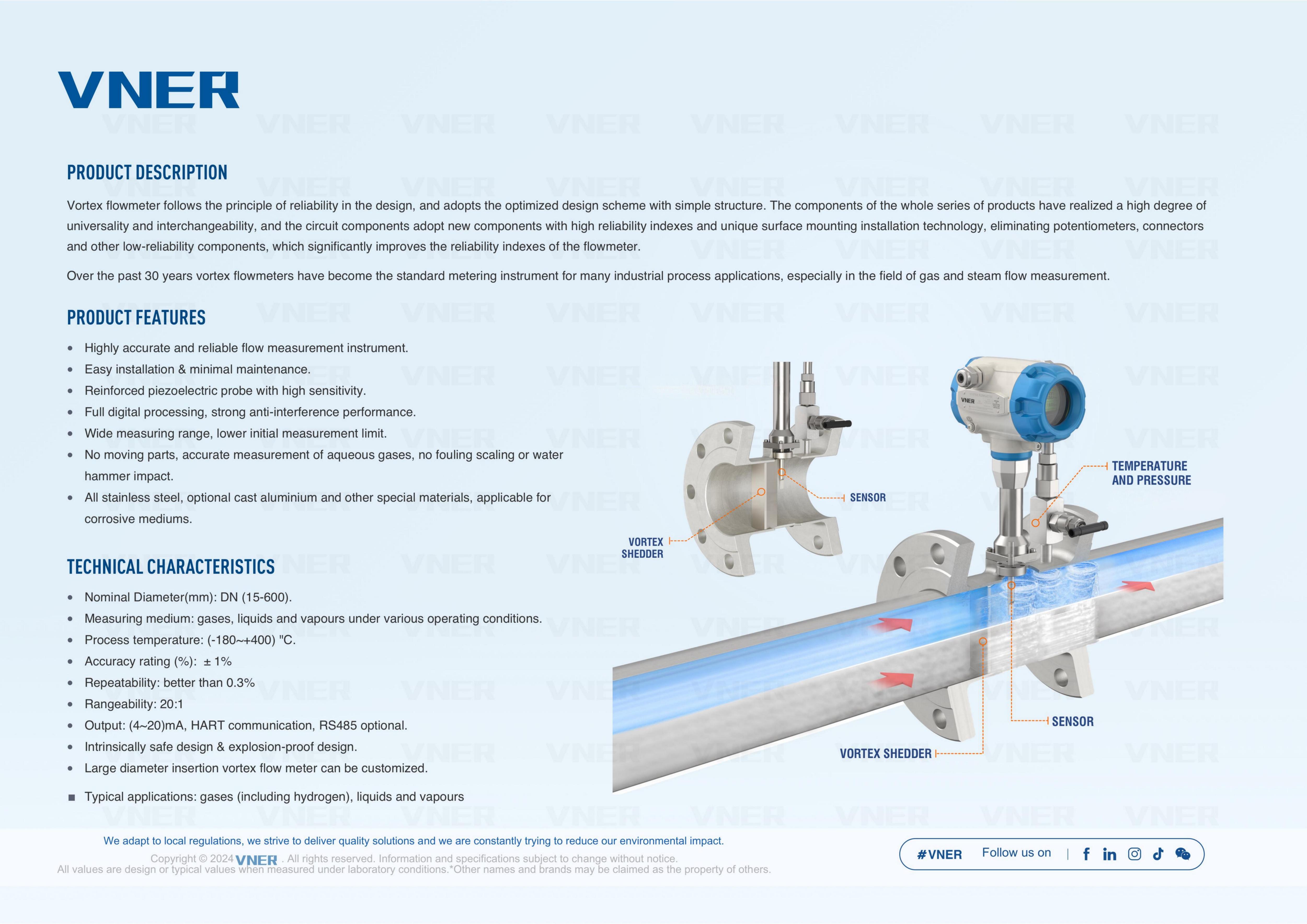 | Compensación de presión | Presión de vórtice | Flujo másico / volumen corregido | ±1,0–1,5% of reading | Vapor saturado, gas comprimido |
